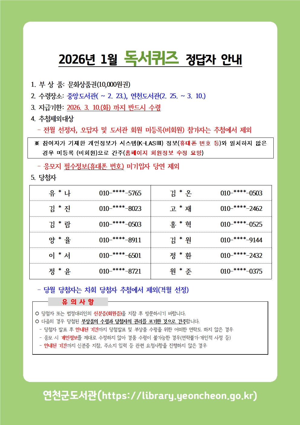 2026년 1월 독서퀴즈 정답자 안내
