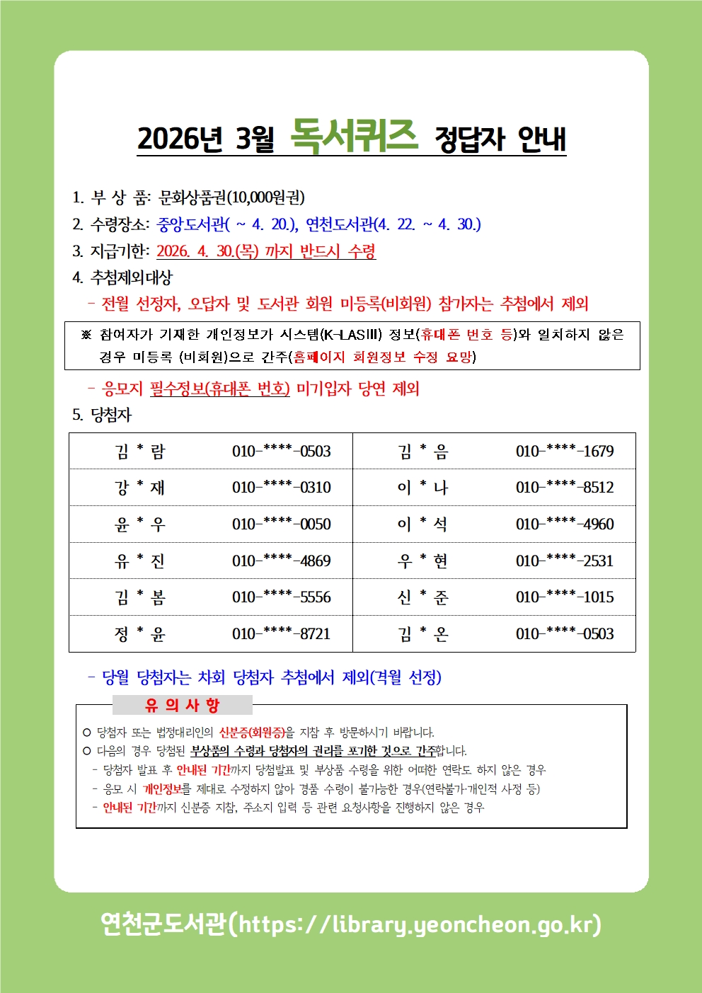2026년 3월 독서퀴즈 정답자 안내