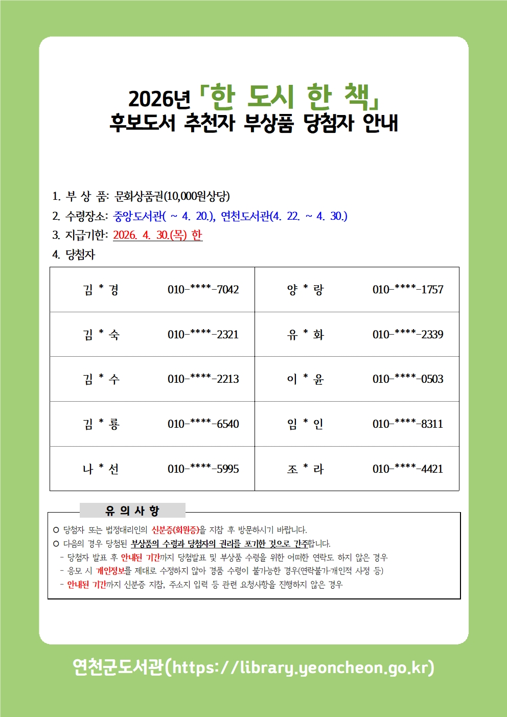 2026년 '한 도시 한 책' 읽기 같이 또 함께 참여자 부상품 당첨자 안내