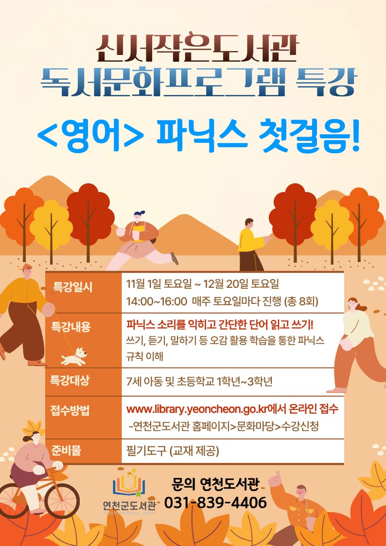 | 강좌/행사명 | 종료 <장소변경!!>작은도서관 독서문화프로그램 : <영어> 파닉스 첫걸음! |