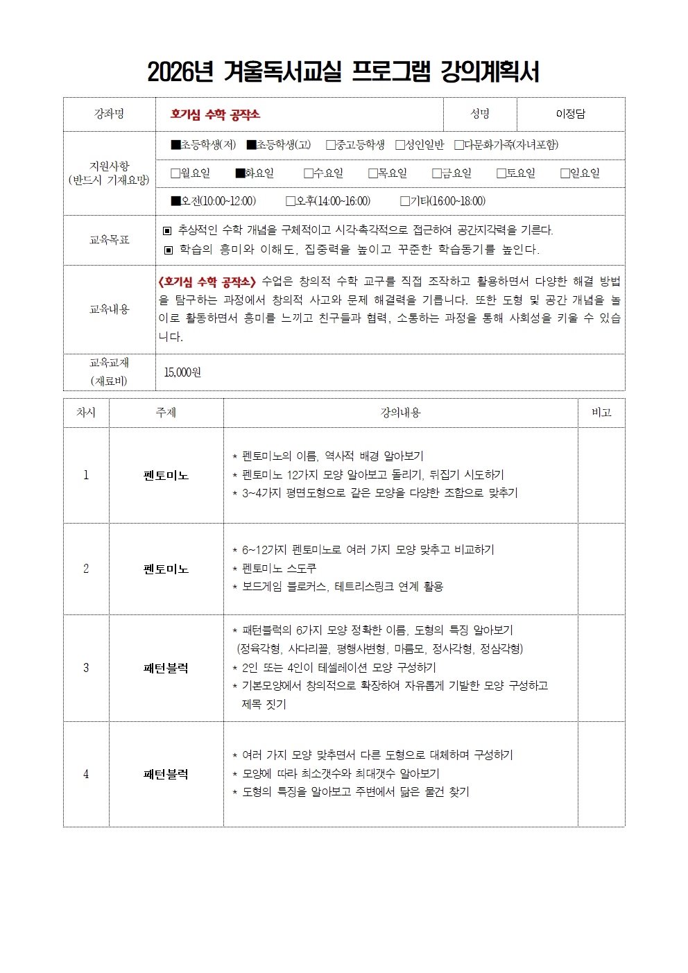 | 재료비 | 15,000원(수학교구 2개 배부) |