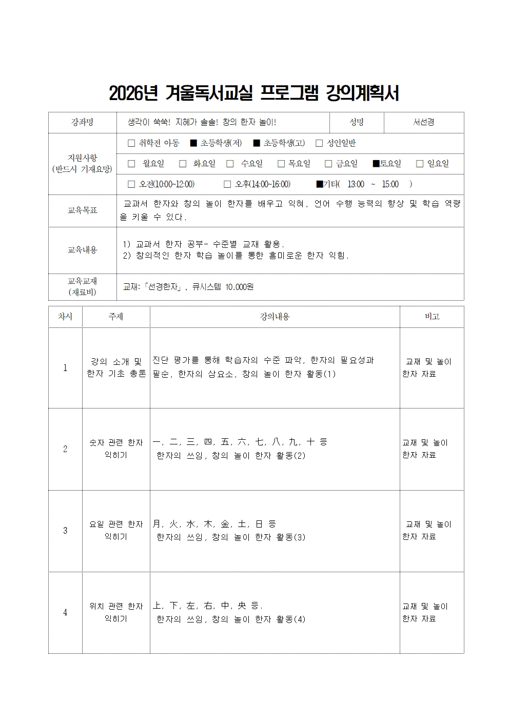 | 강좌/행사명 | 종료 생각이 쑥쑥! 지혜가 솔솔! 창의 한자 놀이! |