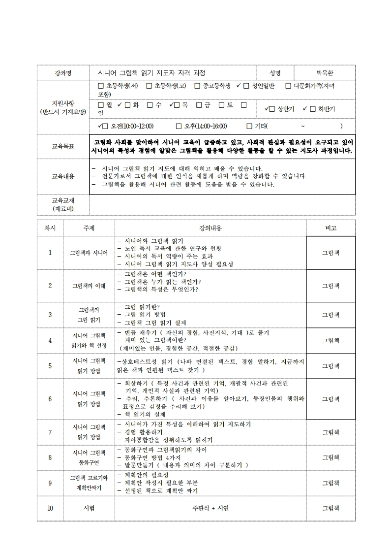 | 강좌/행사명 | 종료 시니어 그림책 읽기 지도사 자격 과정 |