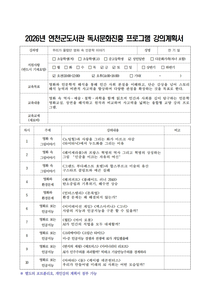 | 강좌/행사명 | 대기접수 우리가 몰랐던 영화 속 인문학 이야기 |