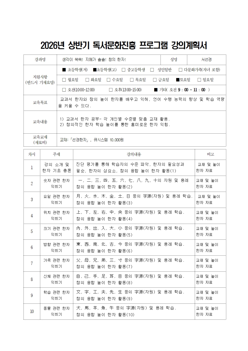 | 강좌/행사명 | 종료 생각이 쑥쑥! 지혜가 솔솔! 창의 한자 놀이! |
